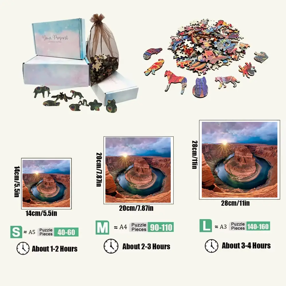 Experience the breathtaking beauty of Arizona’s Horseshoe Bend with our Canyon View Wooden Jigsaw Puzzle. This stunning puzzle captures the serene moment of sunrise over the iconic landscape, inviting you to piece together a masterpiece that celebrates nature’s artistry. Crafted from high-quality wood, each piece fits snugly, ensuring a satisfying assembly experience. Perfect for family fun or a relaxing solo challenge, this puzzle not only enhances your problem-solving skills but also serves as a beautiful decor piece once completed. Dive into the tranquility of the canyon and bring home a slice of the great outdoors today!