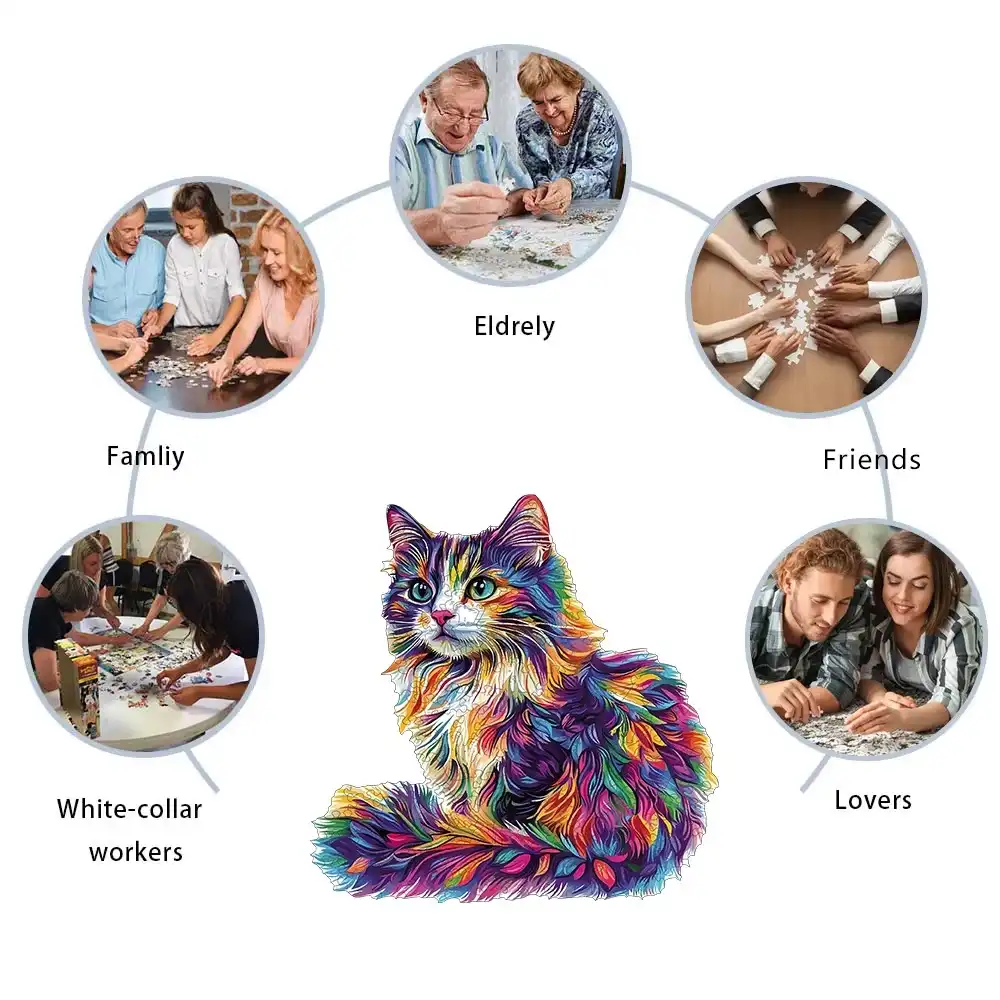 Dive into a world of fun and challenge with our Colored Cat Wooden Jigsaw Puzzle! This vibrant puzzle features adorable cat designs that will brighten your day while testing your problem-solving skills. With the words “difficult” boldly displayed, it promises an engaging experience for puzzle enthusiasts of all ages. Perfect for a cozy night in or a fun activity with friends, this puzzle not only entertains but also enhances your cognitive abilities. Grab yours today and let the colorful cats bring joy and challenge to your home!