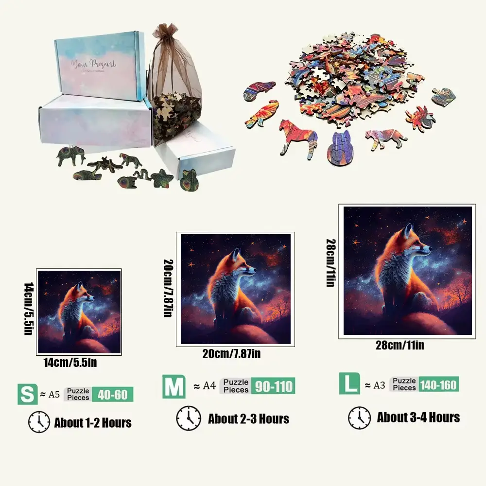 Immerse yourself in the enchanting world of the Fox At Dawn Wooden Jigsaw Puzzle. This beautifully crafted puzzle features a stunning depiction of a fox against a mesmerizing night sky, inviting you to piece together a serene moment of nature. Made from high-quality, eco-friendly wood, each piece fits perfectly, ensuring a satisfying assembly experience. Perfect for puzzle enthusiasts and nature lovers alike, this captivating artwork not only provides hours of entertainment but also makes for a charming decor piece once completed. Bring home this delightful puzzle and let the magic of the night sky inspire your creativity!