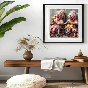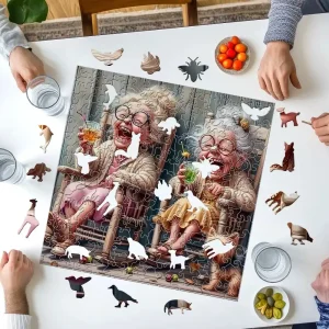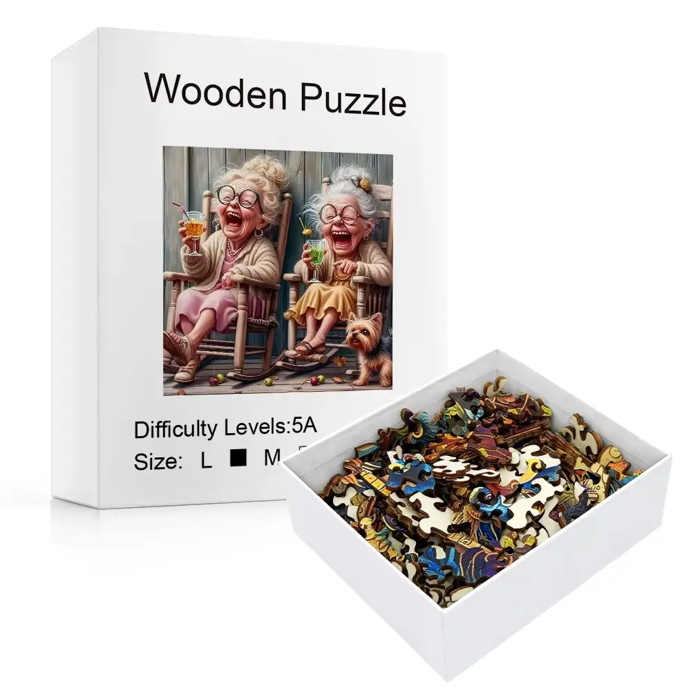 Delight in the heartwarming scene of the Laughing Grandmamas Wooden Jigsaw Puzzle, featuring two charming elderly ladies enjoying their drinks in rocking chairs, accompanied by a playful dog. This beautifully crafted wooden puzzle not only offers hours of engaging entertainment but also serves as a nostalgic reminder of cherished moments with loved ones. Made from high-quality, eco-friendly materials, each piece fits together seamlessly, ensuring a satisfying assembly experience. Perfect for puzzle enthusiasts and a thoughtful gift for family and friends, this delightful puzzle invites you to unwind and create lasting memories.