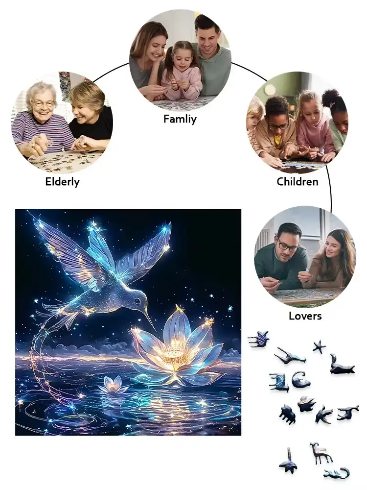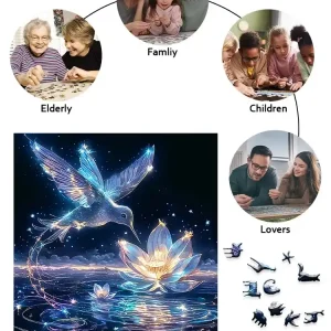 Experience the beauty of nature with our Hummingbird Wooden Jigsaw Puzzle, featuring a stunning image of a bird soaring over a delicate lotus flower beneath a twinkling starry sky. Crafted from high-quality wood, this puzzle not only offers a delightful challenge but also serves as a captivating piece of art for your home. Each piece fits together seamlessly, ensuring a satisfying assembly experience that promotes mindfulness and relaxation. Perfect for puzzle enthusiasts and nature lovers alike, this exquisite jigsaw puzzle makes for an ideal gift or a serene pastime to enjoy alone or with family.