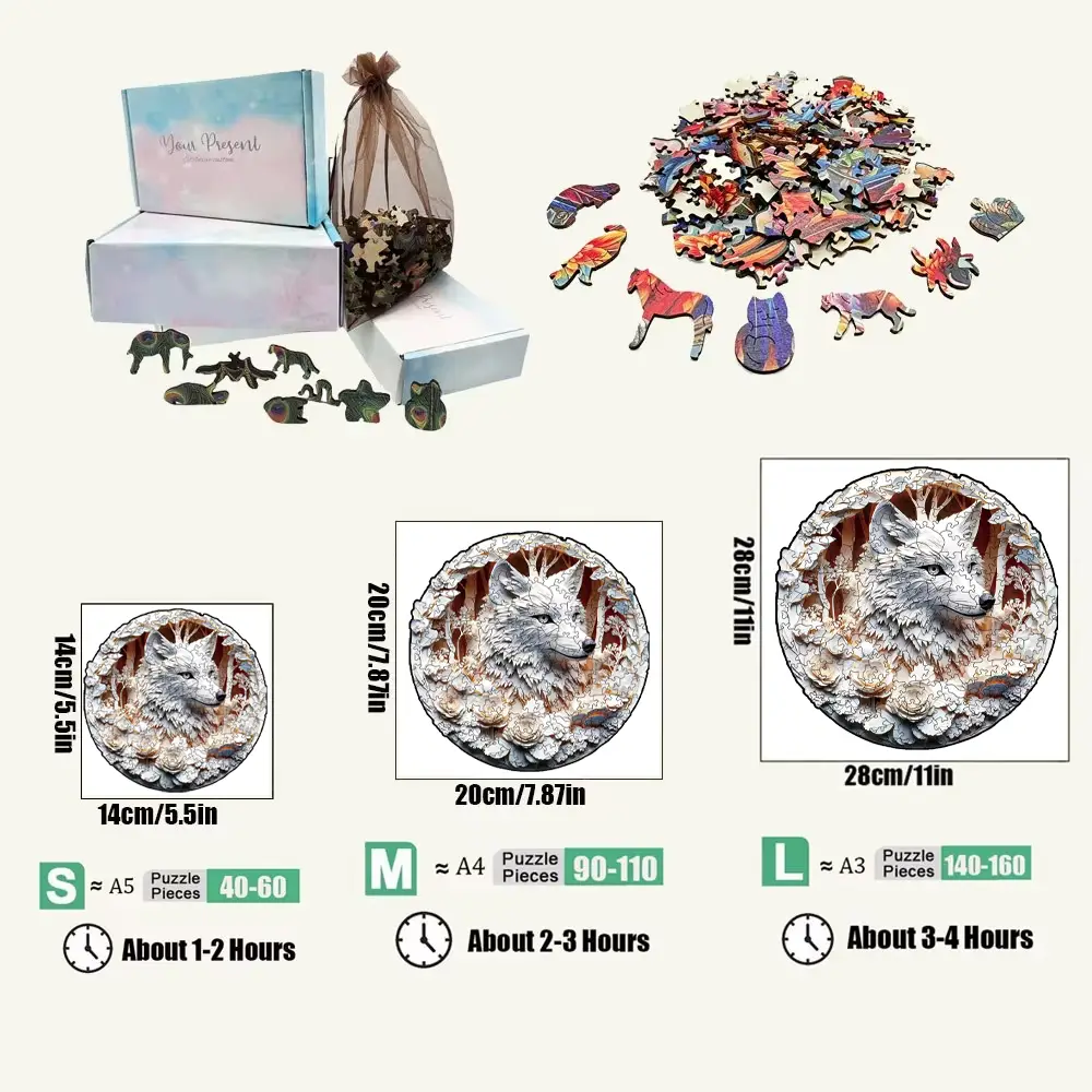 Discover the enchanting beauty of nature with our White Wolf Wooden Jigsaw Puzzle. This stunning puzzle features a majestic white wolf gracefully surrounded by vibrant flowers and lush leaves, bringing a touch of wilderness into your home. Crafted from high-quality wood, each piece fits together seamlessly, providing a satisfying challenge for puzzle enthusiasts of all ages. Perfect for family bonding or a relaxing solo activity, this puzzle not only sharpens your mind but also serves as a captivating piece of art once completed. Embrace the spirit of the wild and add this exquisite puzzle to your collection today!